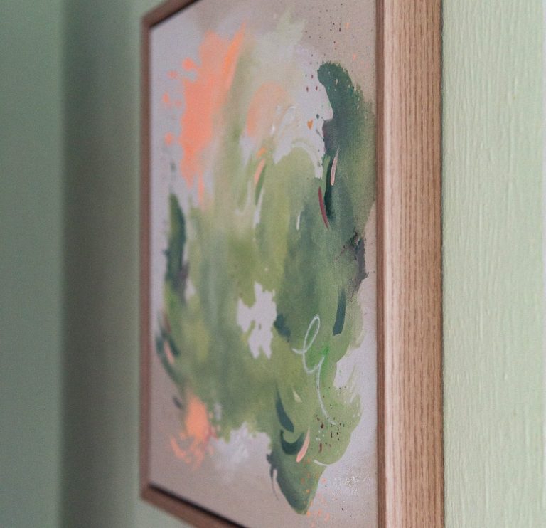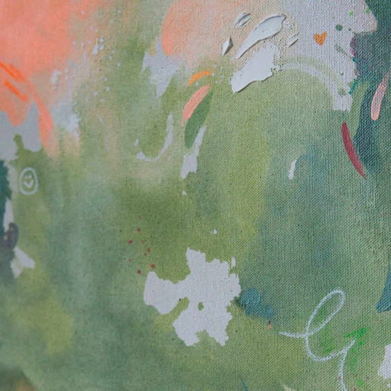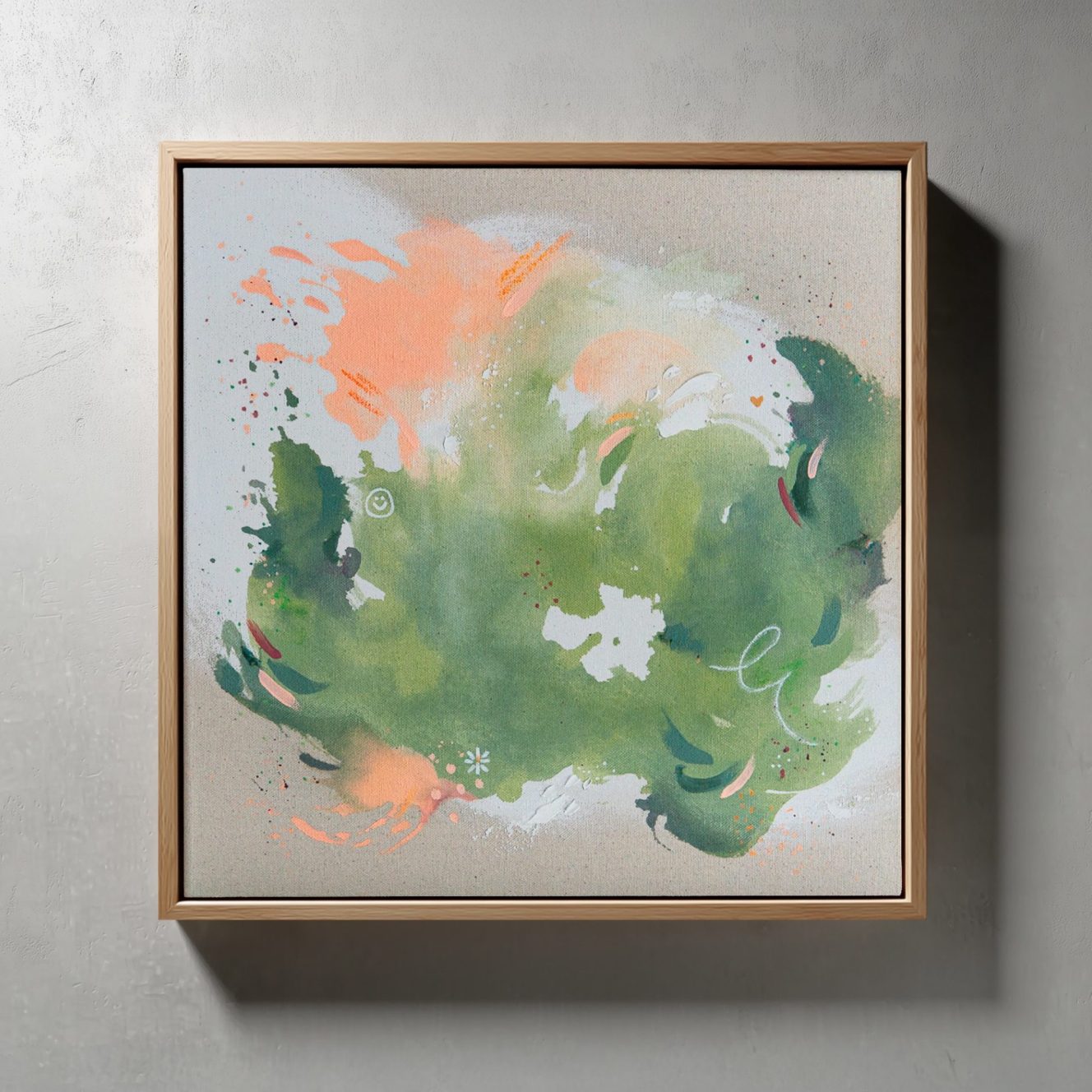 Ein Spiel aus sattem Grün, leuchtendem Apricot und feinen Neonakzenten. Das Werk wirkt wie ein Atemzug Natur auf Leinwand: voller Bewegung und Leichtigkeit. Ein Bild, das Energie schenkt und Räume erfrischt.