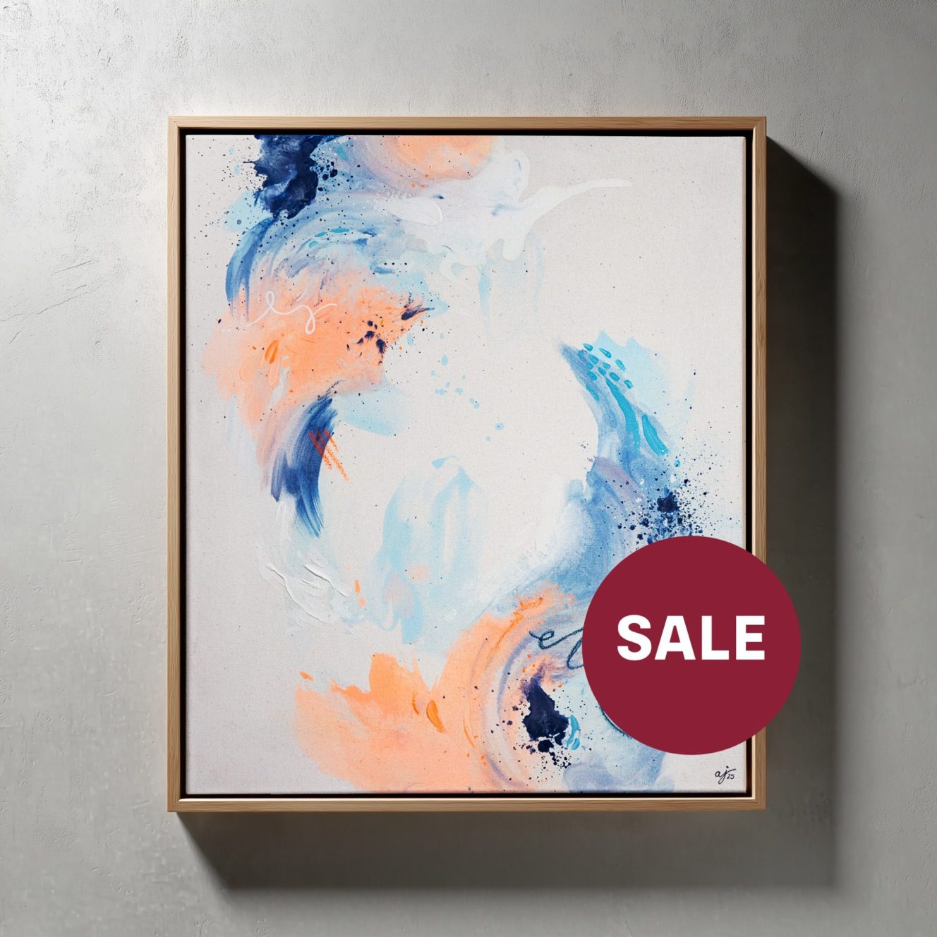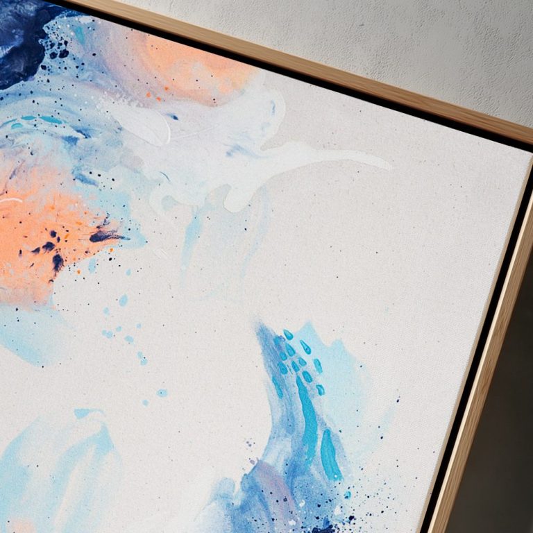 Energie trifft auf Leichtigkeit. Dieses Kunstwerk spielt mit kräftigem Blau, sanftem Apricot und fließendem Weiß – ein Zusammenspiel, das Bewegung sichtbar macht. Jeder Pinselstrich und jeder Farbspritzer erzählt seine eigene Geschichte.