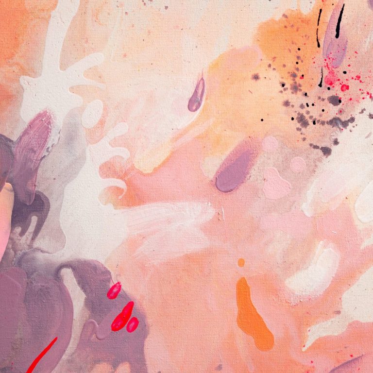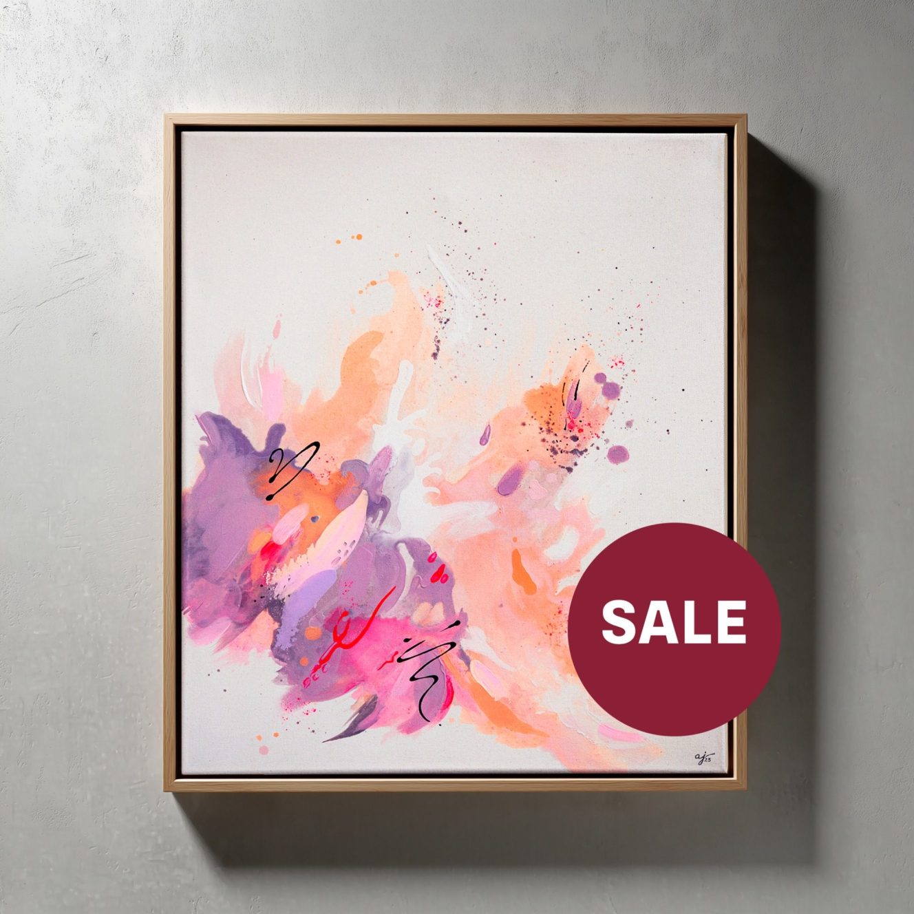 Leuchtende Apricot-, Violett- und Rosétöne treiben dynamisch über die Fläche. Wer genau hinsieht, entdeckt inmitten der Komposition die Silhouette eines Seepferdchens – verborgen und absolut zufällig.