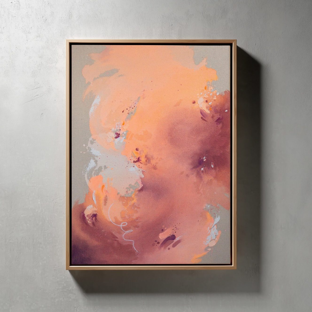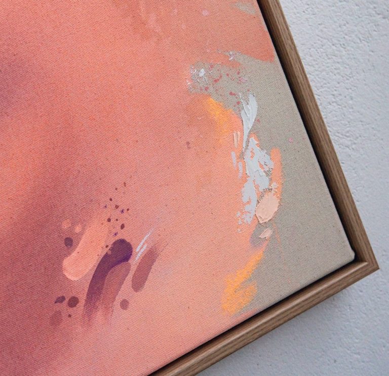 Wie ein Pfirsichsturm: „Peach Mist“ entfaltet sich in sanften Rosé- und Pfirsichtönen, kombiniert mit kräftiger Aubergine, durchzogen von zarten Sprenkeln und weichen Strukturen. Feinfühlig und voller Anmut.